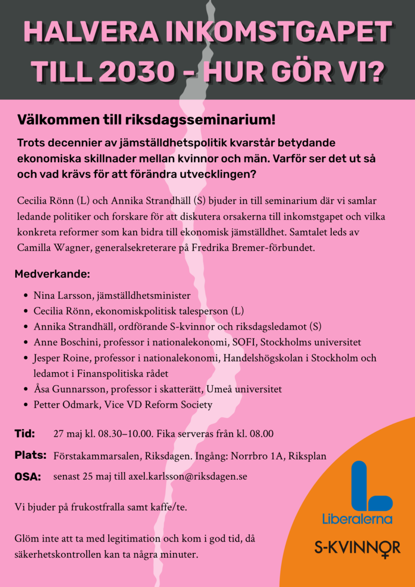 Onsdagen den 27 maj bjuder riksdagsledamot Cecilia Rönn (L) och Annika Strandhäll (S) in till ett riksdagsseminarium för att lyfta inkomstgapet mellan kvinnor och män. Tillsammans med forskare och experter kommer det att diskuteras vilka konkreta politiska reformer som kan bidra till ekonomisk jämställdhet. Seminariet utförs med inspiration av Fredrika Bremer-förbundets vitbok ”Därför blir män rikare än kvinnor”. Samtalet leds av Fredrika Bremer-förbundets generalsekreterare, Camilla Wagner. Medverkar gör även jämställdhetsminister Nina Larsson (L).